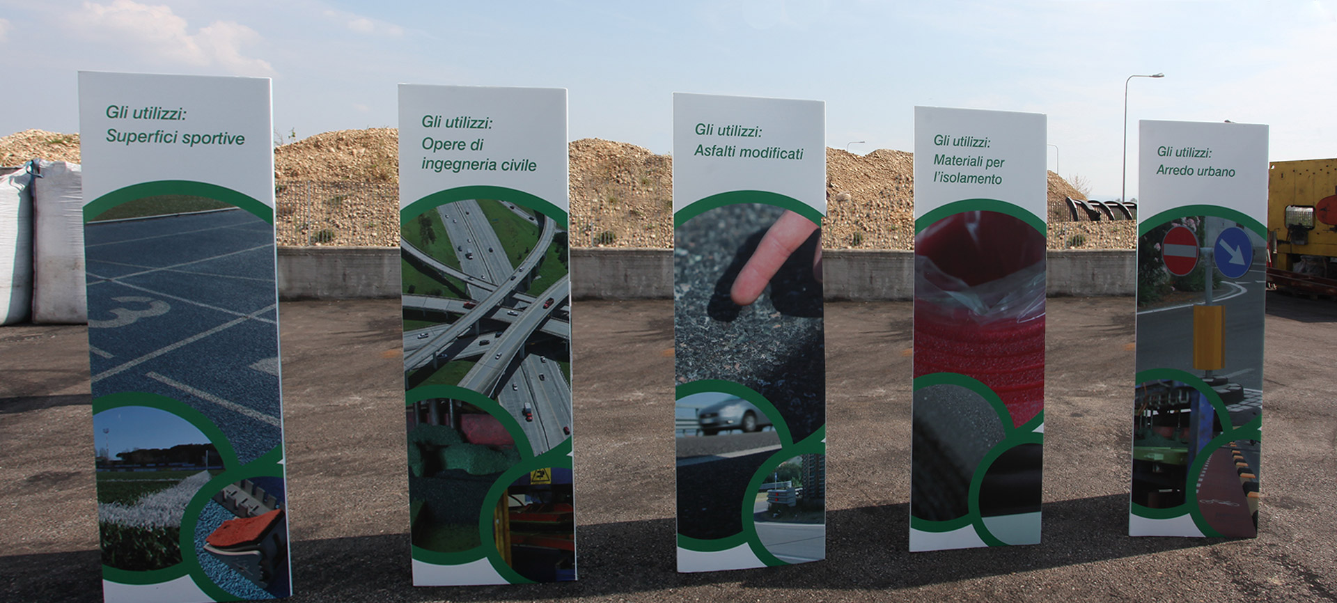 The rubber present on the tyre is treated to obtain granules and powders on various sizes.